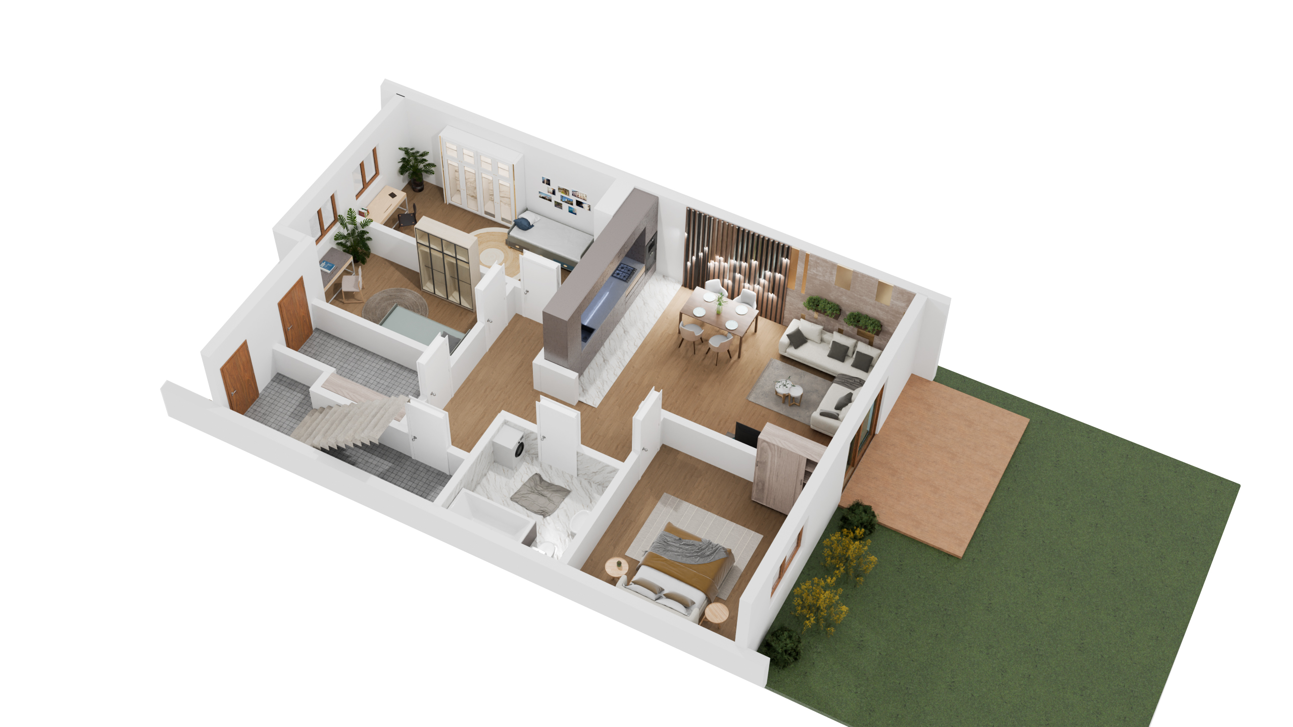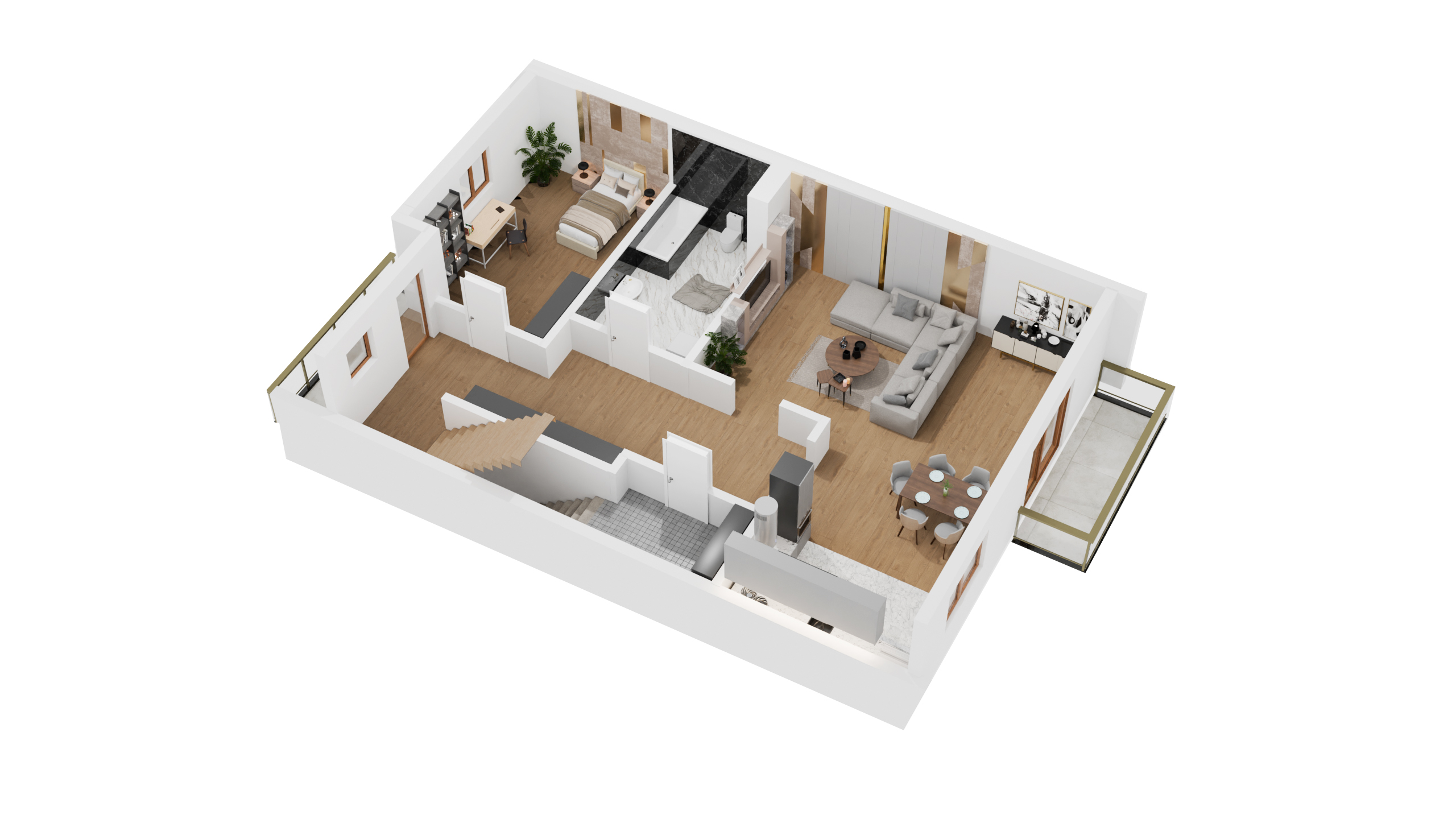 Apartamenty na piętrze zapewniają wygodę i dodatkową przestrzeń na poddaszu. Pierwsze piętro stanowi strefę dzienną mieszkańców. Znajdziesz tu przestronny, jasny salon z otwartą kuchnią, wygodną łazienkę oraz pokój gościnny, który również może pełnić rolę gabinetu do pracy.