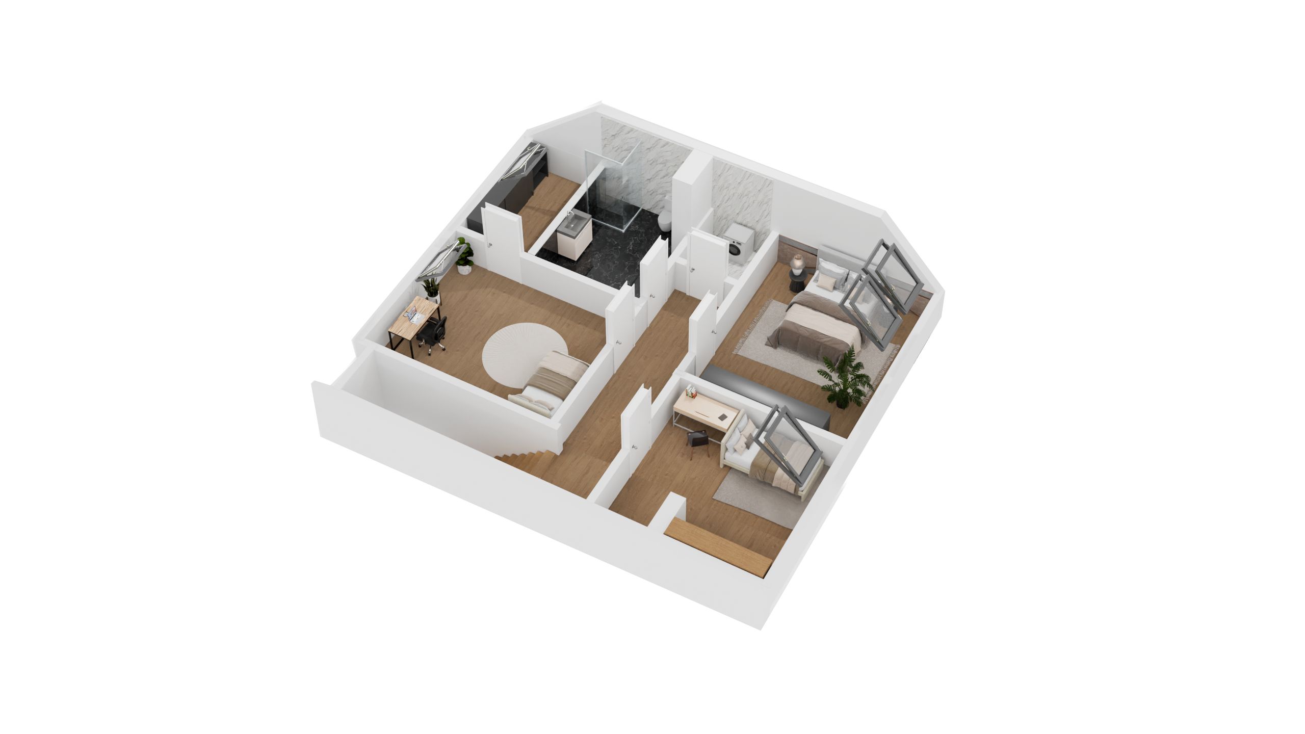 Poddasze oferuje 3 komfortowe sypialnie , garderobę oraz łazienkę. Na osiedlu znajdziesz budynki w dwóch typach. Oba układy są wygodne i zaprojektowane w sposób zapewniający komfort codziennego użytkowania. Poznaj nasze apartamenty i wybierz swoje idealne mieszkanie.